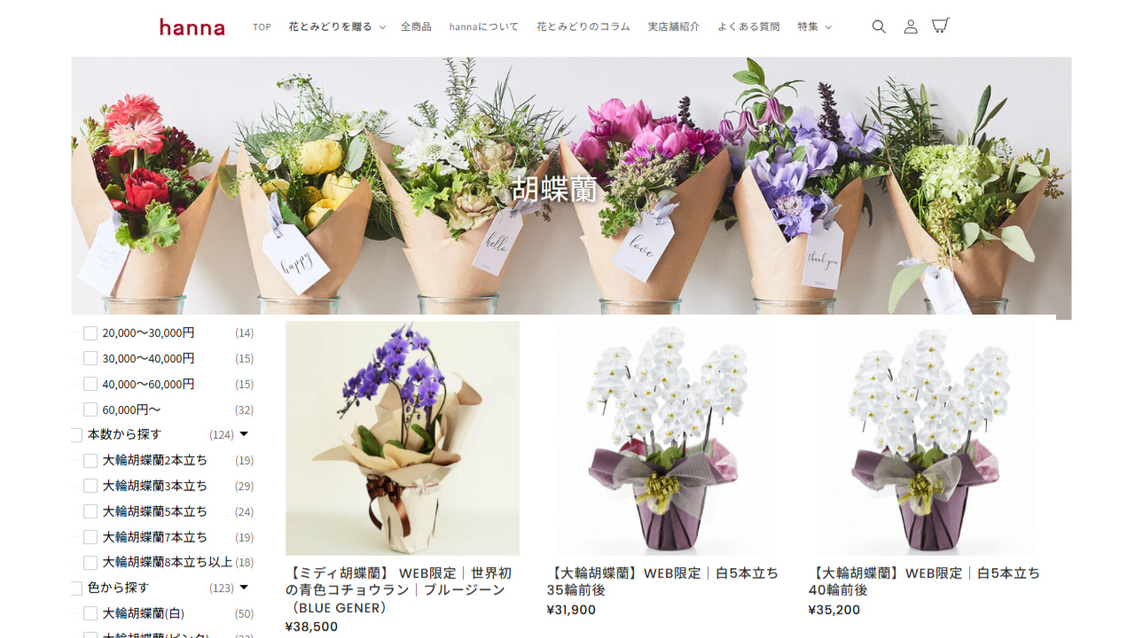 - 価格帯の幅と選びやすさ・・1万円以下の手頃な商品から、30万円を超える高級胡蝶蘭まで、予算に応じた提案ができるか。